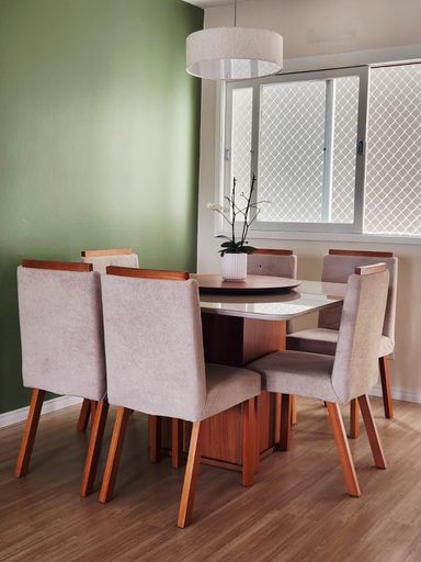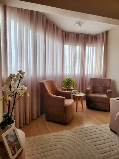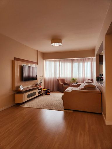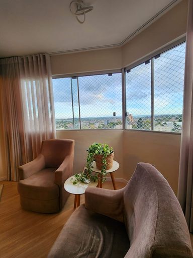 O imóvel conta com 2 dormitórios, 2 banheiros, ampla sala de estar e jantar integradas, cozinha grande, lavabo, lavanderia e um espaço ideal para escritório. A sacada com janela panorâmica oferece uma vista encantadora e iluminação natural abundante, tornando o ambiente ainda mais agradável.